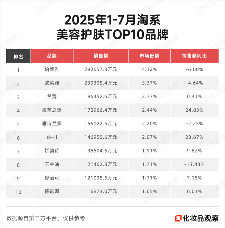 TOP10阵营中,珀莱雅以29.27亿元的销售额稳居首位;海蓝之谜增速最高,同比增长24.83%;SK-II同样表现亮眼,实现23.67%的高速增长。