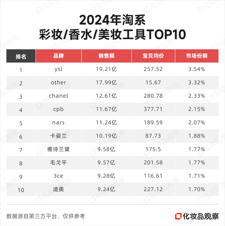 以毛戈平为例,数据显示,2024年淘系彩妆TOP10中,CPB以377.7元的均价位居最高,而均价超过200元的品牌共有四个,分别为香奈儿、YSL、迪奥和毛戈平,其后则是NARS与雅诗兰黛。