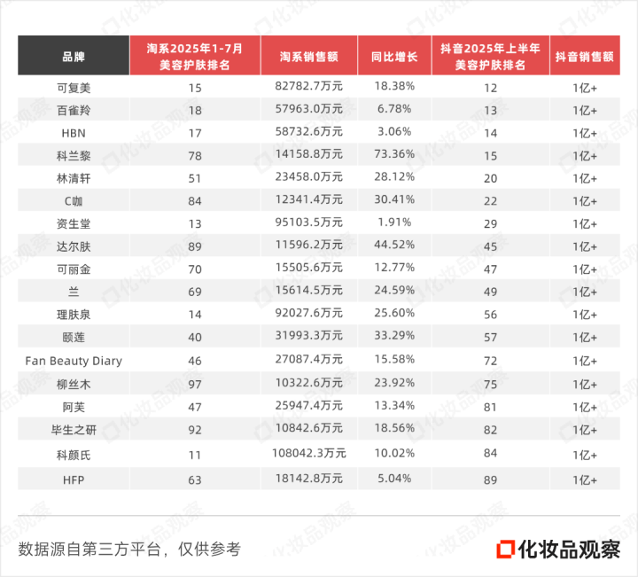 HBN、毕生之研、优时颜和兰等新锐品牌同样增长稳健。HBN销售额达5.87亿元,同比增长3.06%,排名第17;毕生之研、优时颜和兰均实现双位数增长。